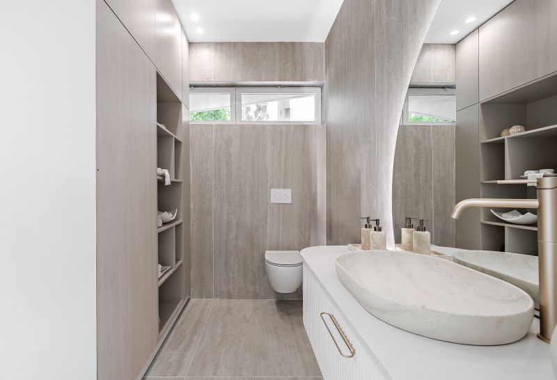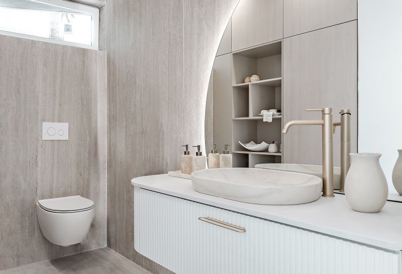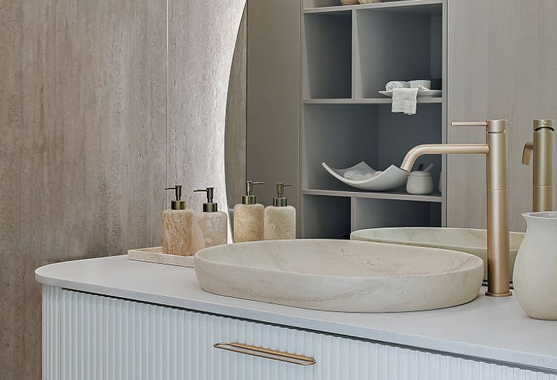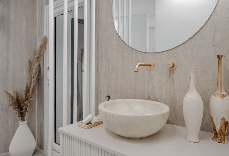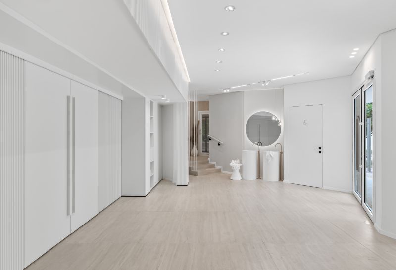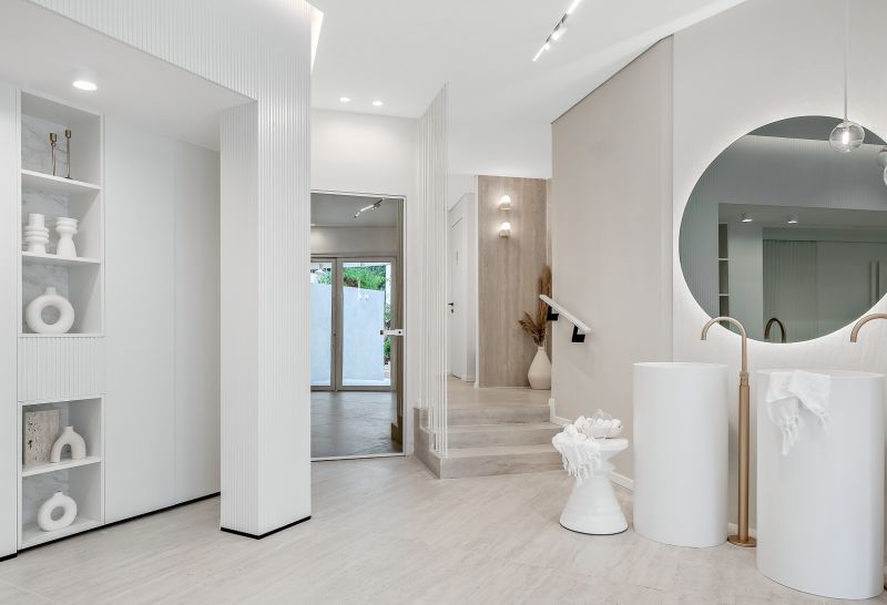 לריצוף ולחיפוי נבחרו אריחי פורצלן מדוקקים בדוגמת אבן טרוורטין (קולקציית ELISIAN), בעלי קו אחיד ונקי. הם מעניקים לחלל נופך עיצובי אלגנטי ומחברים באופן טבעי, דרך ויטרינות זכוכית, בין החוץ לפנים.