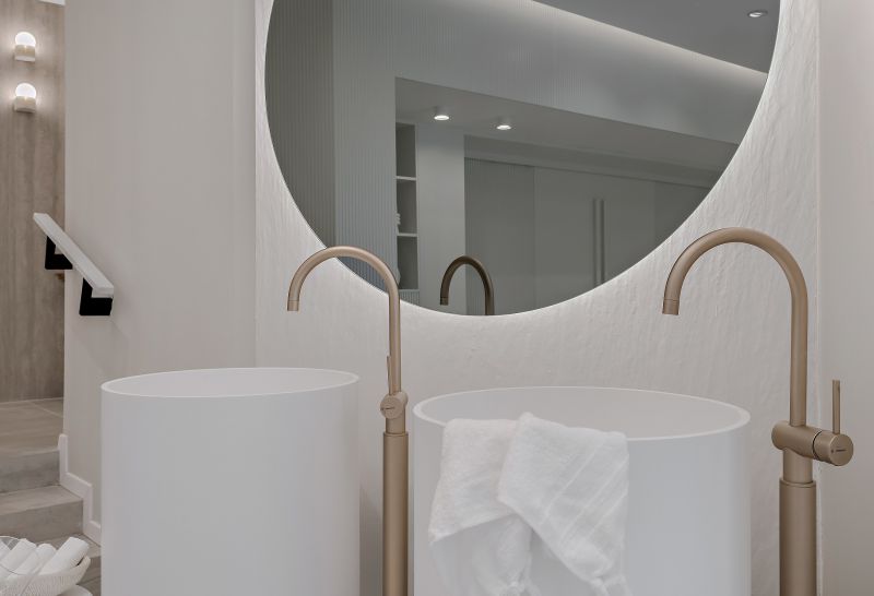 בנוסף, שילבנו בחלל פרטי תאורה פרקטיים לצד דקורטיביים, פינות נטילת ידיים מהודרות הכוללות ברזים רצפתיים בגוון זהוב מוברש מבית NEWFORM איטליה וכיורי קוריאן, חיפויי נגרות בהתאמה אישית ומחיצות זכוכית מעוצבות. נתנו דגש מיוחד לנקודות המפגש והניתוק בין החומרים השונים כדי ליצור אווירה רוחנית מעצימה מלאת השראה וקדושה.