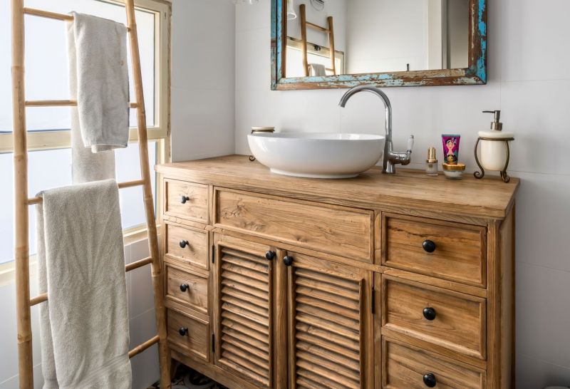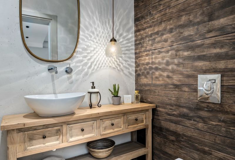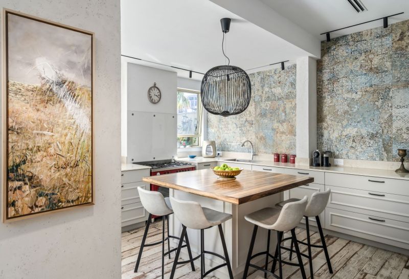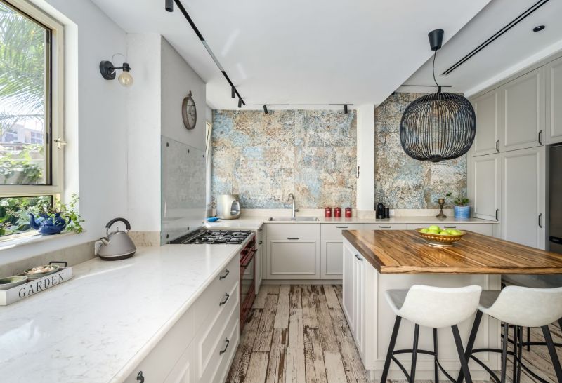 גרניט פורצלן המדמה ריצפת עץ בסגון שאבי שיק בגוון בהיר, ארונות עץ מלא, טיח מסוג ווגה שמוסיף עניין וטקסטורה. אריחים גדולים וצבעוניים בחיפוי קיר מטבח, כאלה שאי אפשר להתעלם מהם, שיוצרים מראה מעניין כמו יצירת אמנות מרהיבה.
