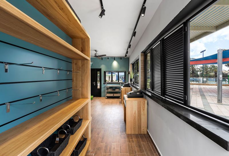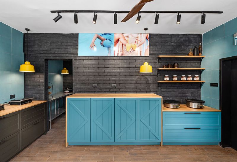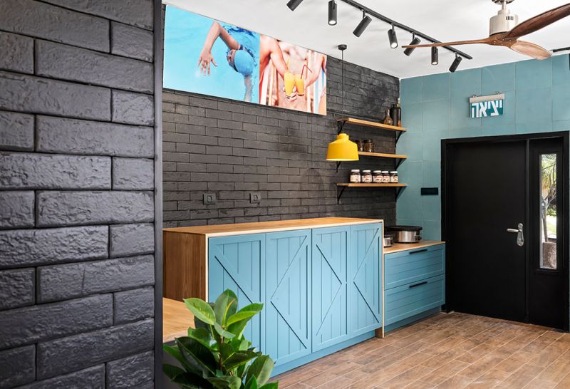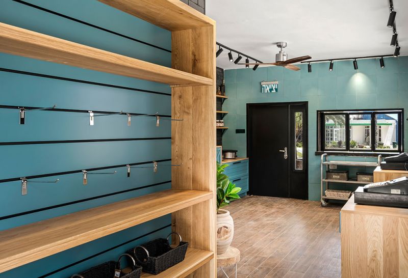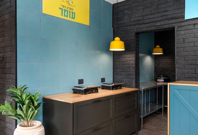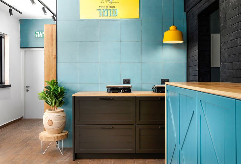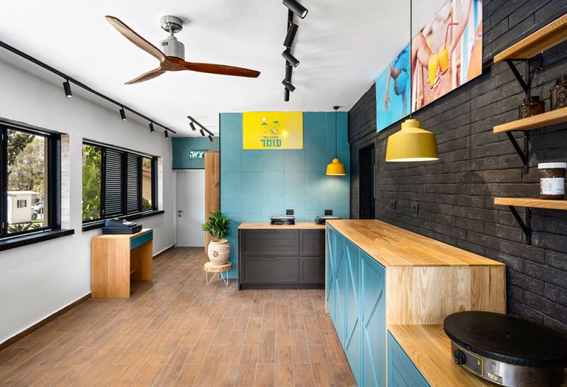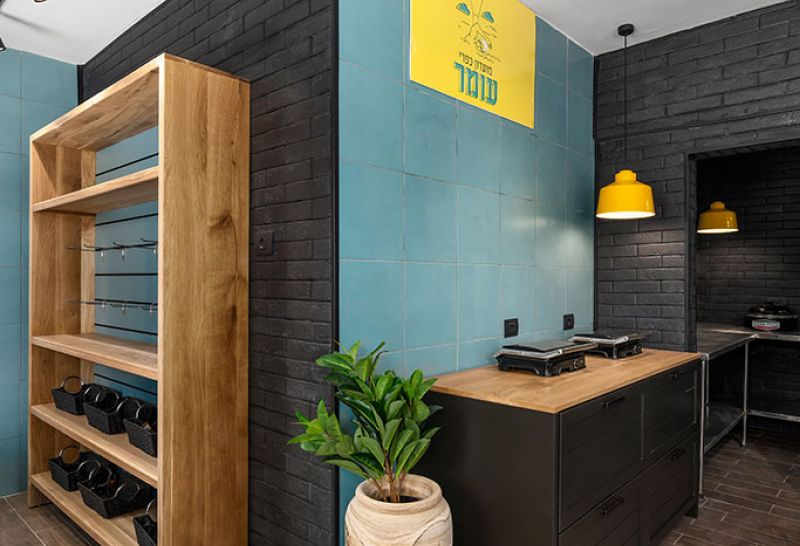 לרצפה נבחרו אריחים דמויי פרקט שהתאימו לאווירה במקום ובמקביל, מאפשרים רמה פרקטית גבוהה של ניקיון ותחזוקה. חיפוי בריק שחור נועד להבליט ולהדגיש את הטורקיז והצהוב ולתת להם מקום בולט יותר ועוצמתי בניראות של המכלול.
