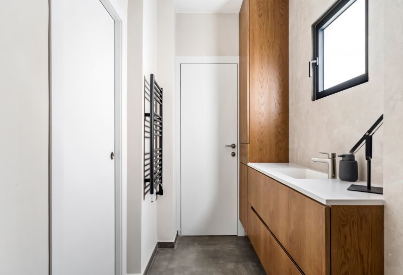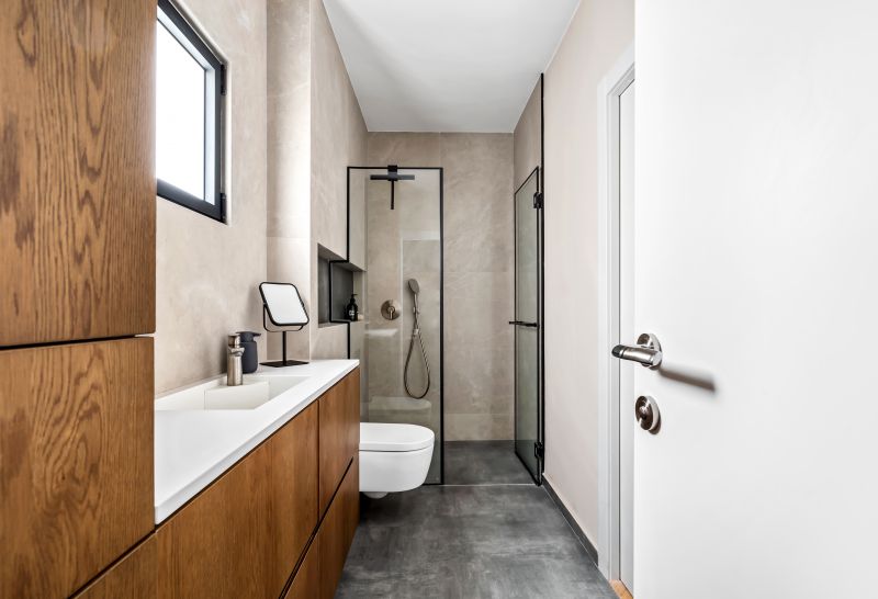 הרבה חומרים טבעיים עם נגיעות של טורקיז. לוחות חיפוי גרניט פורצלן דמוי אבן בחדרי הרחצה, טקסטורות שונות בחדרי הרחצה של חלודה ועץ, פרקט פישבון.