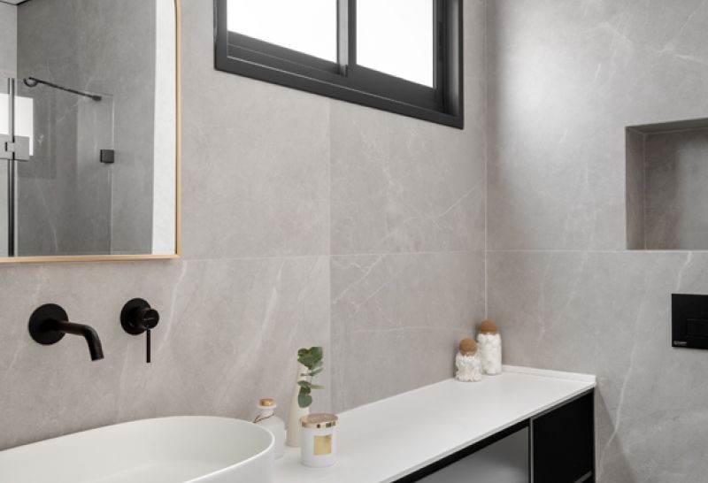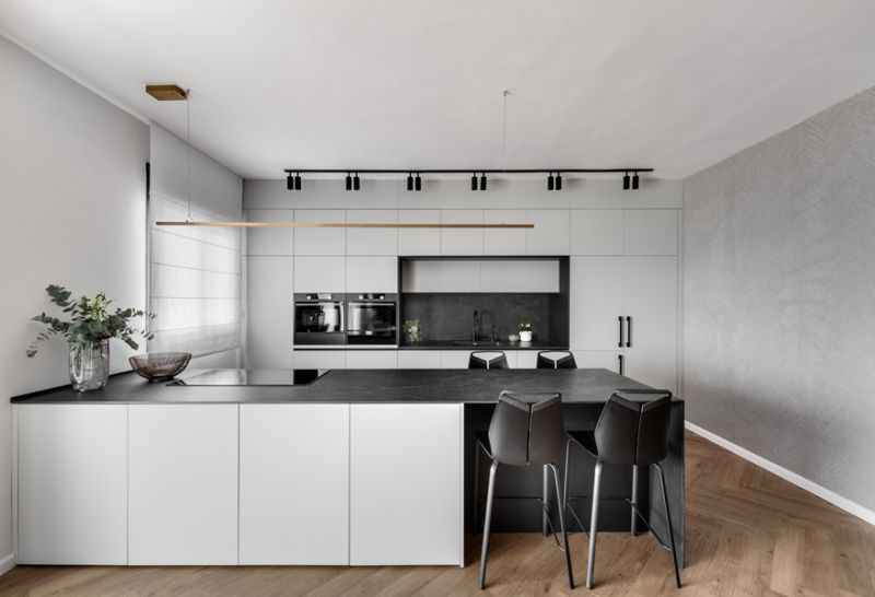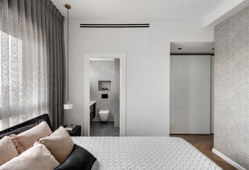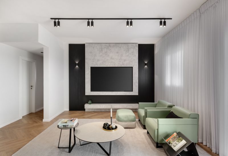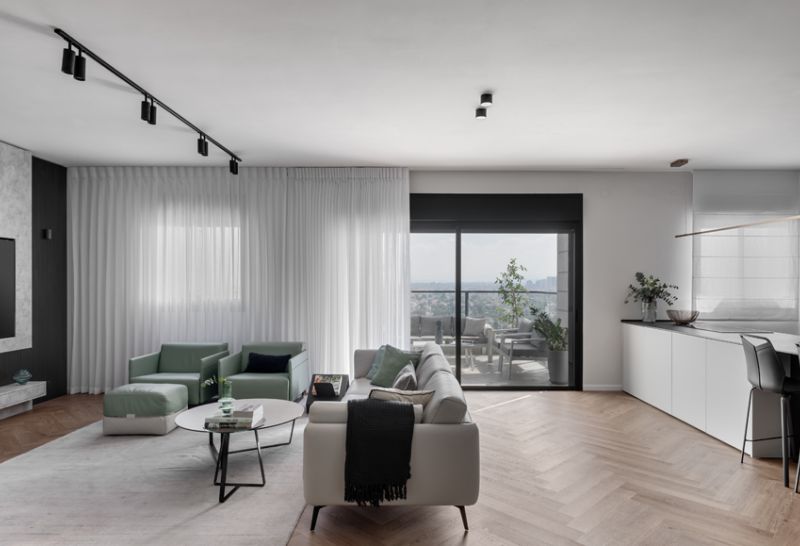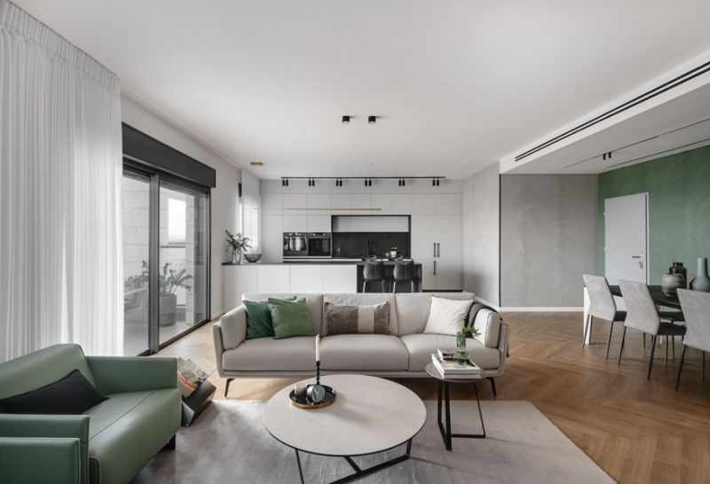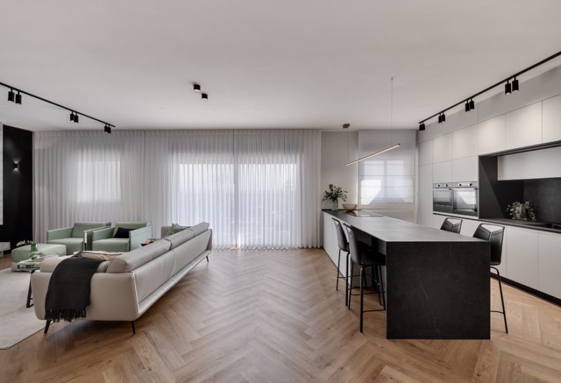 הסגנון המוביל היה מודרני, איטלקי, על-זמני. לחלל המרכזי בחרנו פלטת צבעים מוגדרת הכוללת גווני אבן בהירים, נגיעות שחורות מתובלות בגוון מנטה. פרקט הפישבון תורם גם הוא לתחושת החמימות והאווריריות של המרחב.