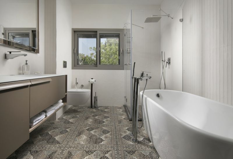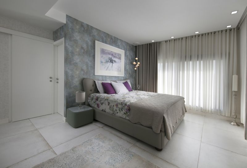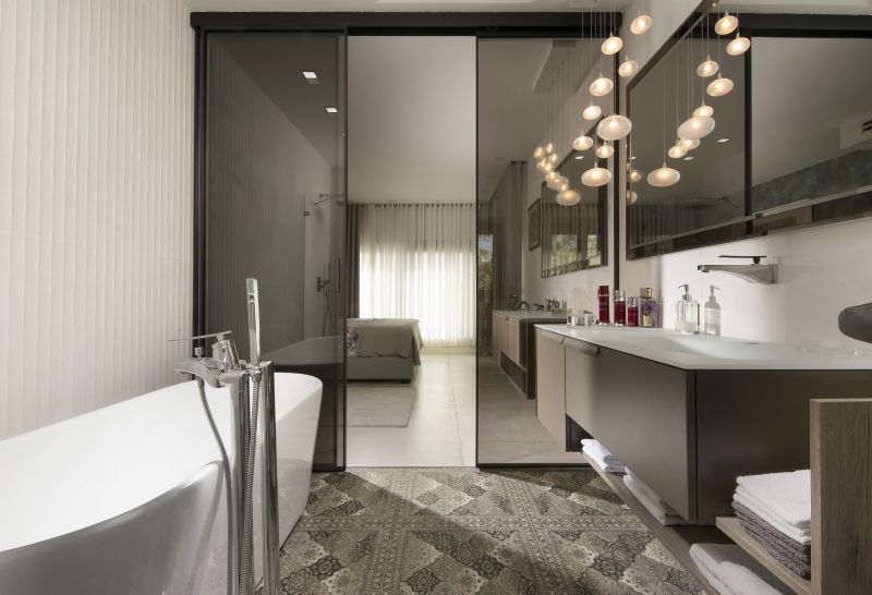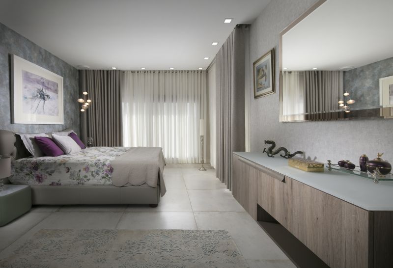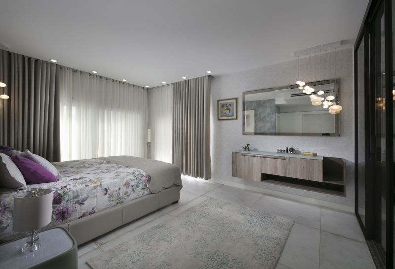 מודרני עם נטיה קלאסית. בחדר השינה מיטה של פרנקו פריי עם גב קפיטונאז'. ריצוף חלל אמבטיה עם אריחים בדוגמת שטיח בגווני חום מעניק כיוון טיפה יותר קלאסי ואמנותי.