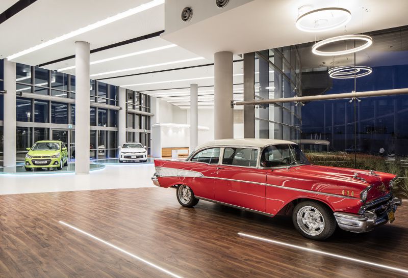מדובר בקומפלקס המרכז את כל המותגים של קבוצת UMI – יוניברסל מוטרוס ישראל, יבואנית הרכבים האמריקאים, שהעתיקו את מתקני ההנהלה מראשון לציון, בני ברק ועוד כדי לרכז את כל הפעילות במוקד אחד המותאם לצורכיהם. מדובר בפרויקט בקנה מידה גדול בעלות של כ-250 מיליוני שקלים, ומאחורי ההקמה עומד משרד הוק אדריכלים, בבעלות דורית ודורון הוק. "חברת UMI רכשה את הקרקע והקימה את כל הקמפוס החדיש, הכולל מבנה של משרדים, מבנה של רווחה לעובדים עם חדר אוכל ופונקציות נוספות, אולם תצוגה לכלי הרכב של מותגי החברה - בהם איסוזו, שברולט וקדילק - וכן מוסך מרכזי", מספר אדריכל ארנון אוקסנברג ממשרד הוק אדריכלים. "המוסך המרכזי עדיין נמצא בשלבי הקמה, אולם יתר הפונקציות כבר פעילות ומאכלסות מאות עובדים ומבקרים הפוקדים את המתחם מדי יום".